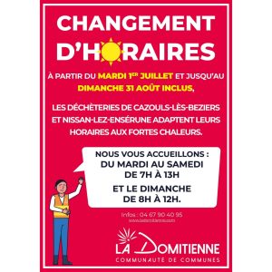 Pour la deuxième année consécutive, la Communauté de communes La Domitienne adapte les horaires des déchèteries de Cazouls-lès-Béziers et Nissan-Lez-Enserune pour la saison estivale Du mardi 1er juillet au dimanche 31 août inclus, place aux horaires d’été pour mieux faire face aux fortes chaleurs, protéger les agents comme les usagers, tout en maintenant 34 heures…