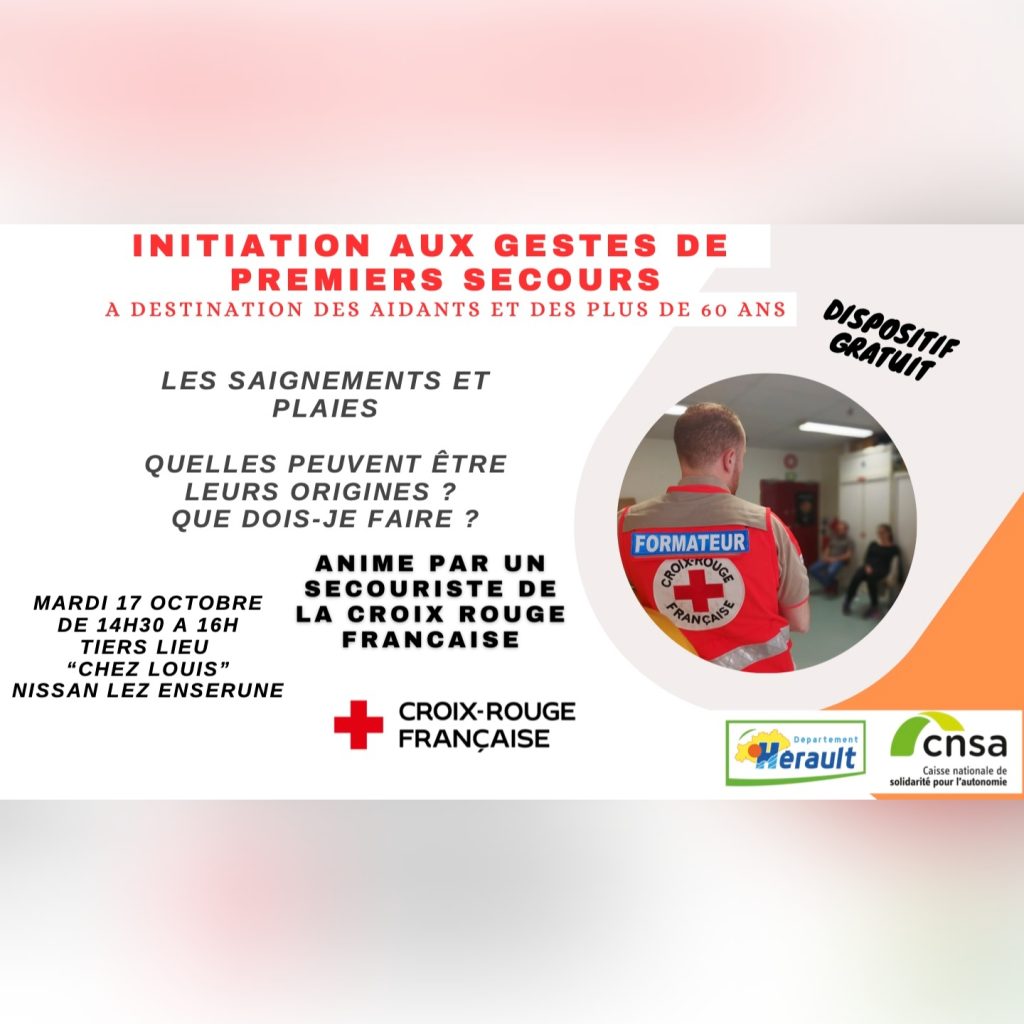 A destination des aidants et des plus de 60 ans Les saignements et plaies Quelles peuvent être leurs origines ? Que dois-je faire ? Mardi 17 octobre 2023 de 14h30 et 16h00 Tiers lieu “Chez Louis” Rue Sainte Eulalie Nissan-lez-Ensérune 04.67.30.97.85 Animé par un secouriste de La Croix Rouge Française. ️ Dispositif gratuit