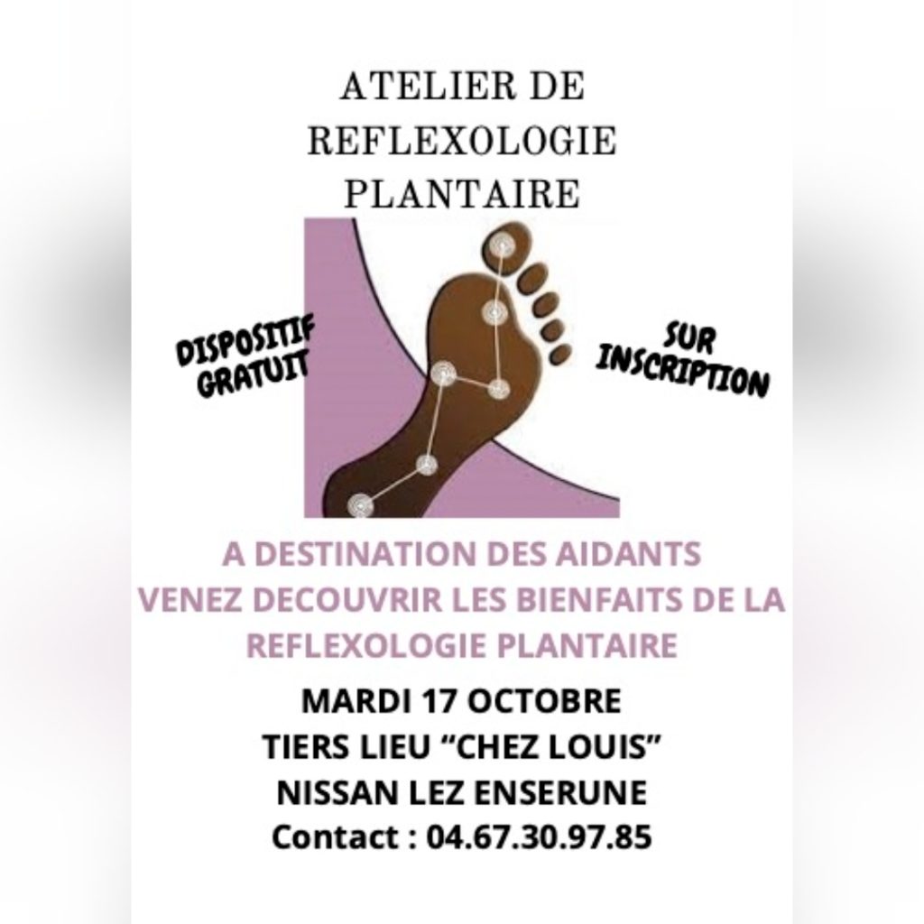 A destination des aidants Venez découvrir les bienfaits de la reflexologie plantaire Mardi 17 octobre 2023 de 09h00 et 13h00 Tiers lieu “Chez Louis” Rue Sainte Eulalie Nissan-lez-Ensérune 04.67.30.97.85 Sur inscription ️ Dispositif gratuit