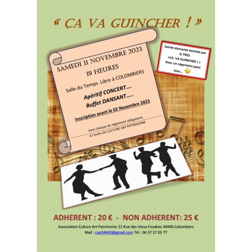 L’Association CAP (Culture Art Patrimoine) organise une soirée dansante animée par le trio “CA VA GUINCHER”, avec un répertoire pour tous Samedi 11 Novembre 2023 19h00 Salle du Temps Libre Inscription obligatoire avant le 02 Novembre 2023 06.37.27.05.77 cap34440@gmail.com